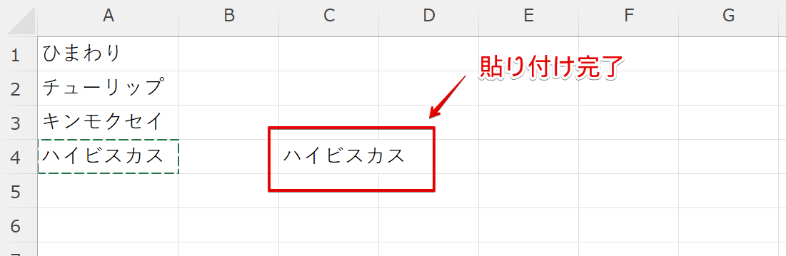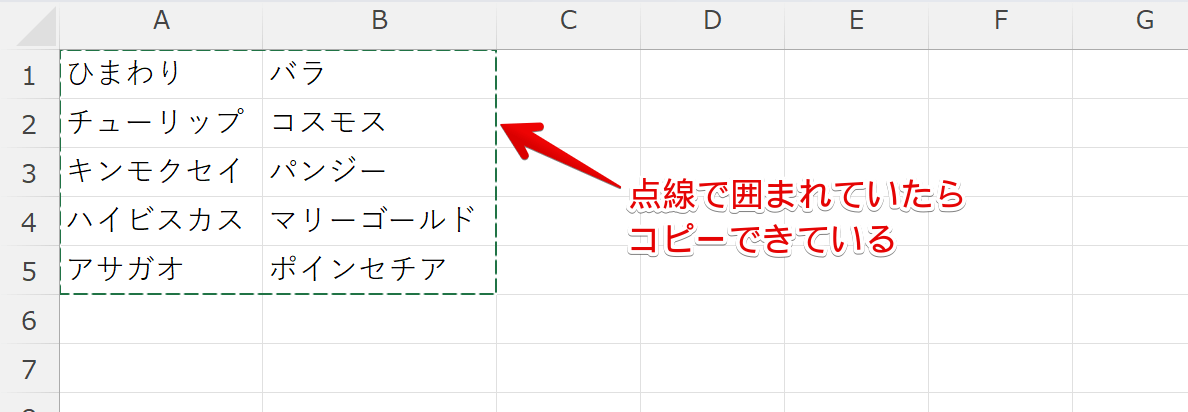 コピー元のセルが点線で囲まれていない場合、コピーが完了していません。