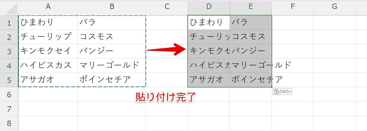 複数セルをコピーした場合も、Ctrl+Vでそのまま貼り付け可能です。